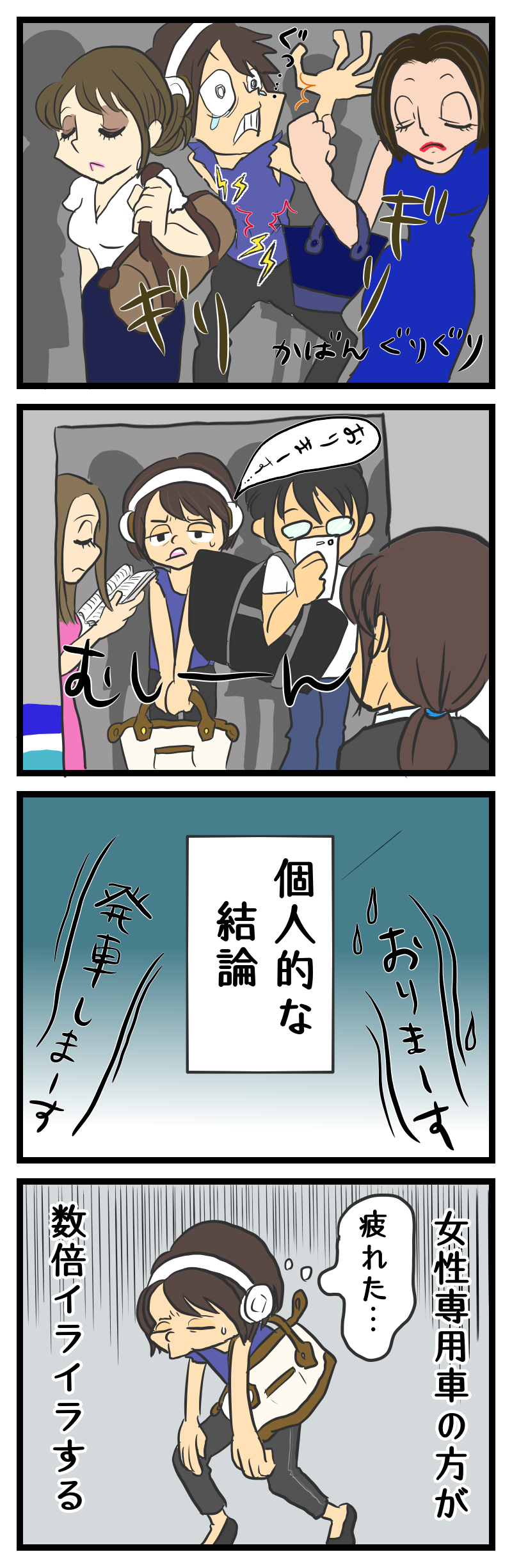 あくまで個人的な意見だけども 2019年08月19日 20:00 私が乗る女性専用車っていつもこんなん。女性の髪の毛のさわさわ感もきついし、女性のカバンって硬いのが多いし、しかも腰あたりの高さに持っている人がすごく多いと思う。当たると痛い。そんでもって入口付近で立ち止まってて周囲が見えていない人も案外多いと思う。だから混雑時の女性専用車って本当に乗らなくなった。男性もいる車両の方がマナーいい様な気がする。あれ?これって千葉県だけかな?っていうか私が使ってる路線だけかも??☟良かったらクリックで応援してください☟ 「日常」カテゴリの最新記事 < 前の記事次の記事 > コメント コメント一覧 (1) 1. さすらいの独人 2023年01月17日 13:40 私は熊本なんで女性専用車輌ってそうなんですね… 0 よたこ がしました このブログにコメントするにはログインが必要です。 さんログアウト この記事には許可ユーザしかコメントができません。 コメントフォーム 名前 コメント 記事の評価 リセット リセット 顔 星 情報を記憶 コメントを投稿する